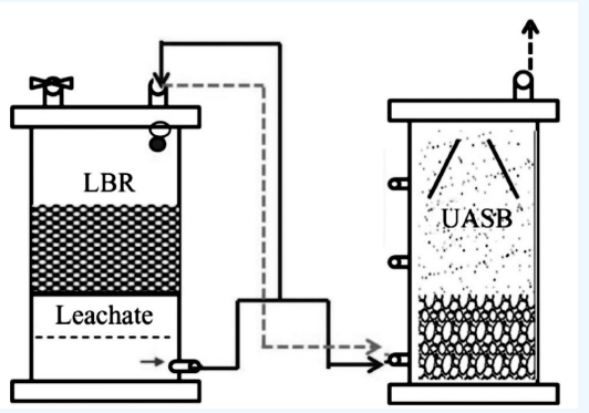 联合厌氧消化是在厌氧条件下,由兼性细菌和厌氧细菌将城市污泥和餐厨垃圾中复杂的高分子有机物分解为二氧化碳、甲烷和水的过程。具体是指在缺氧条件下完成厌氧微生物反应,通过代谢活动降解餐厨垃圾有机物,将餐厨垃圾制成甲烷[2]。具体流程为:设置缺氧环境,水解餐厨垃圾多聚体,在产酸阶段完成乙酸酯化反应,经特殊处理后转化为甲烷,其间应严格控制温度、湿度、酸碱度、微生物性能和设备条件,防止外部条件干扰厌氧消化处理过程。相较于其他餐厨垃圾资源化利用技术而言,厌氧消化流程简单,仅依靠单相反应器即可完成厌氧消化制甲烷过程,但餐厨垃圾中存在大体积有机固体与毒性物质。因此,单相反应器厌氧消化技术易受到毒性物质及大体积固体干扰而产生不稳定性转变,降低餐厨垃圾甲烷生成率,结合当前研究来看,可在城市污泥处理系统辅助下进行混合发酵,经多次试验得出,餐厨垃圾与城市污泥比例维持在1:1时甲烷生产效果最佳,此外还可添加材料减少垃圾气味,加入活性炭等材料提高甲烷生产效果。在厌氧消化处理技术的近年来发展中,人们可以将LBR渗滤床反应器及UASB厌氧污泥床串联,如图1所示,防止过滤板堵塞等问题,减小底物粒径,平衡甲烷生产过程。