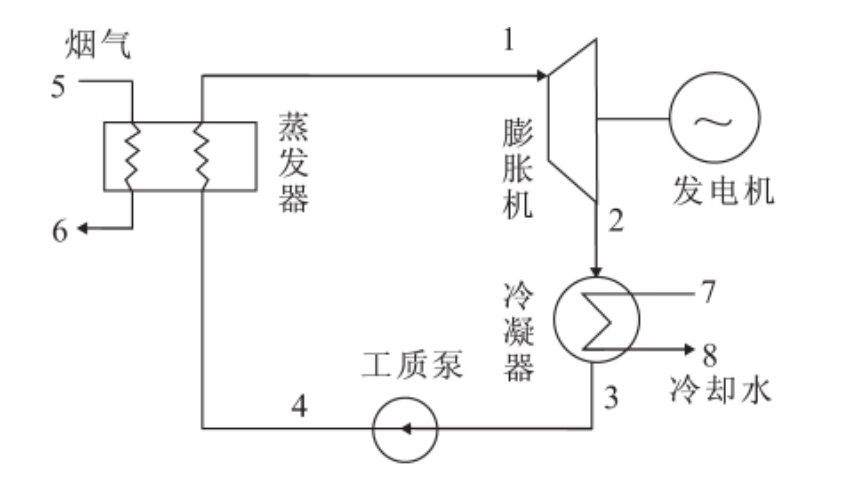 垃圾焚烧是目前垃圾处理的主要方法,焚烧过程中产生的热量可以用到发电中,实现对能源的循环利用,减少排放和满足环保要求,余热发电技术使用水或者低沸点工质发电已经成为回收余热资源的有效途径。目前垃圾焚烧厂烟囱入口烟气温度在150℃左右,会造成比较大的余热损失,利用有机朗肯循环进行低沸点有机工质发电可以有效回收低温余热,在低品位热能利用方面具有较大优势,并且能降低二氧化碳和氮氧化物的排放。