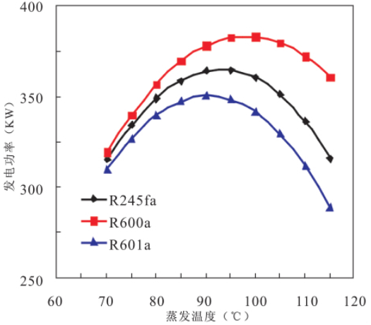 ORC系统净输出功率随着蒸发温度升高先增大后减小,如图3所示,在蒸发温度范围内,三种工质的最大净输出功率为385kW、365kW、350kW,三种工质达到最大净输出功率时温度为100℃、95℃和90℃。根据工质的参数数据,工质的临界温度越低,系统就会有越大的净输出功率,就需要越高的蒸发温度。所以为了获得较高系统输出功率,应该选择临界温度更小的工质。