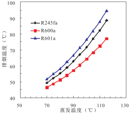 ORC系统排烟温度随着蒸发温度变化的关系如图5所示,系统的排烟温度随着蒸发温度的升高而升高,在蒸发温度相同的情况下,工质的临界温度越低,系统就的排烟温度就会越低。