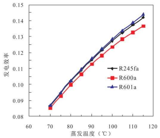 根据图4结果,系统的热效率随着蒸发温度的升高增大,蒸发温度相同时,随着工质临界温度的升高,系统的热效率逐渐降低。