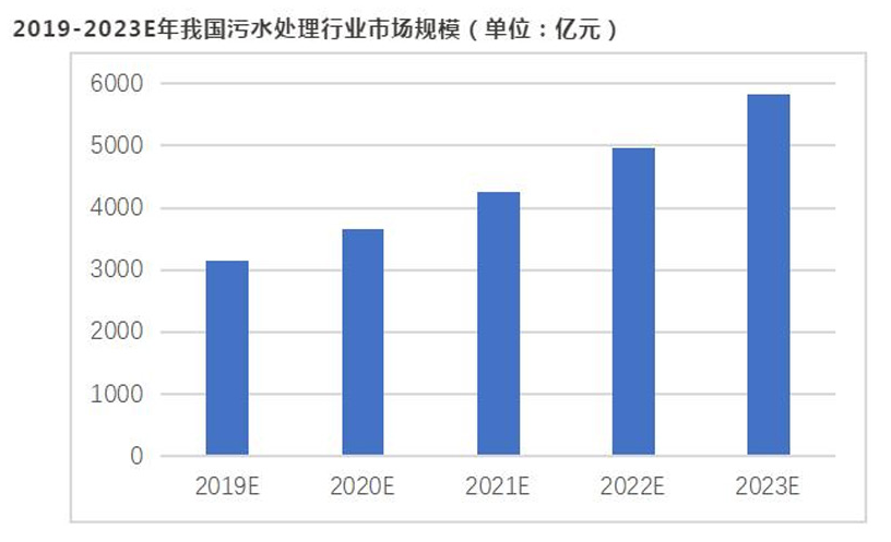 受国家政策支持、各方资本涌入、技术工艺革新等因素驱动,我国污水处理行业将持续快速发展,预计到2023年,我国污水处理行业市场规模将达到5820亿元,2019-2023年复合增长率达14.7%。