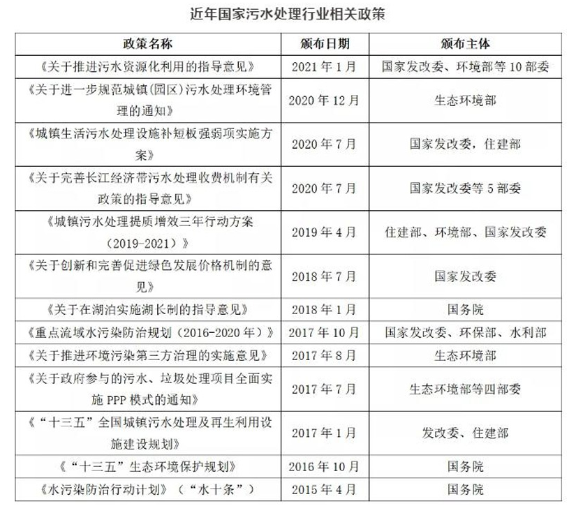 随着我国经济不断发展,生态问题日渐凸显,政府对环保问题日趋重视,近年来,国家出台多项污水处理相关政策,涉及水污染防治、污水处理市场化机制等多方面内容,推动我国污水处理市场不断规范化发展。